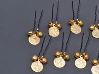 tradition into your hairstyle with this set of ethnic gold coin hair pins. Designed for brides, classical dancers, and festive occasions like Haldi, Sangeet, and Bharatanatyam, these pins add cultural charm to buns, braids, and joodas.