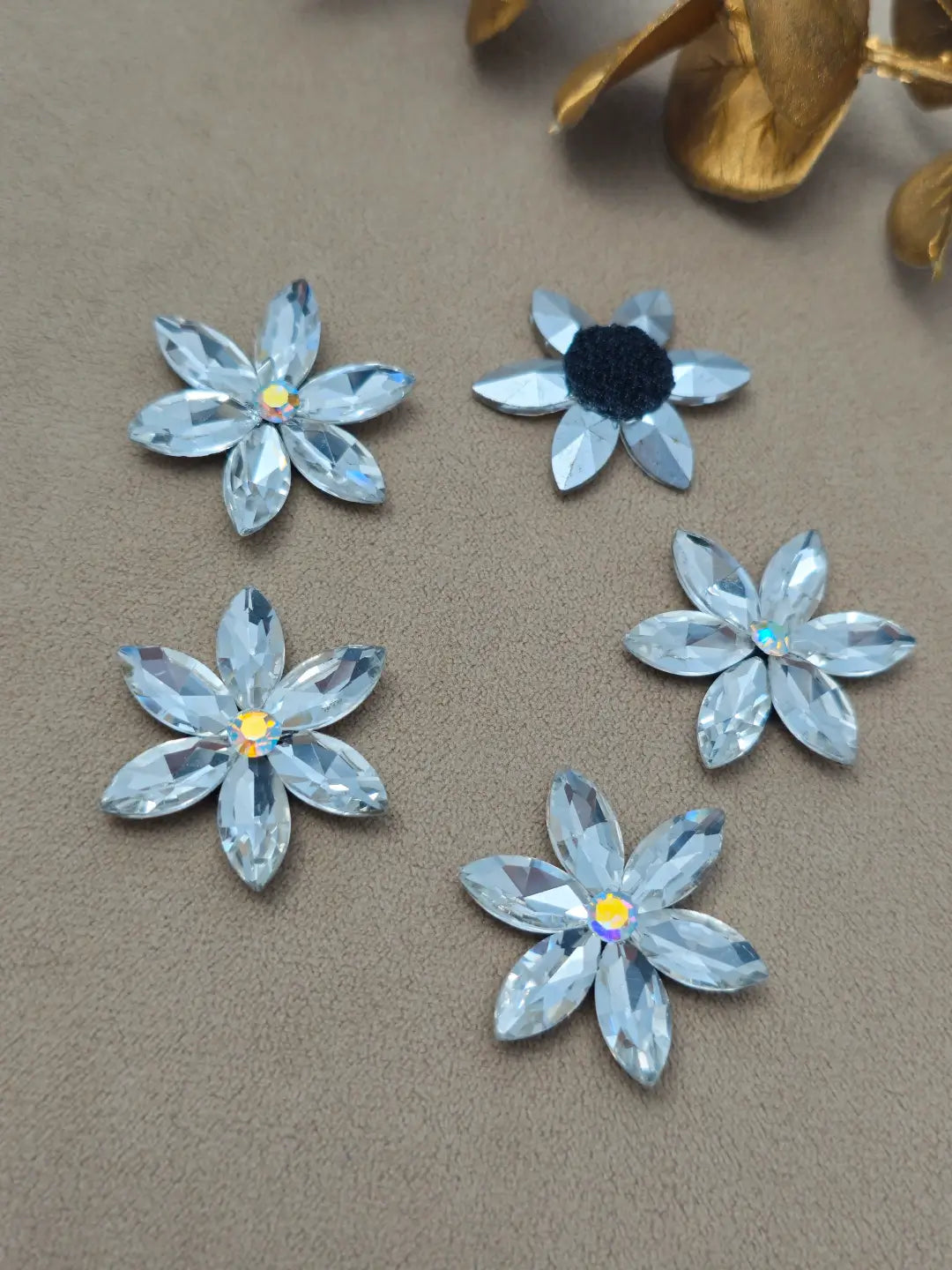 Elegant golden flower-shaped embellishments featuring faceted crystal petals and a brilliant central gem. Each piece showcases a radiant five-petal design that reflects light beautifully.