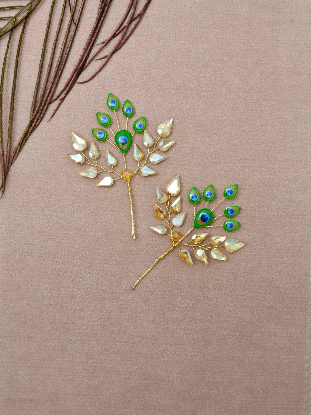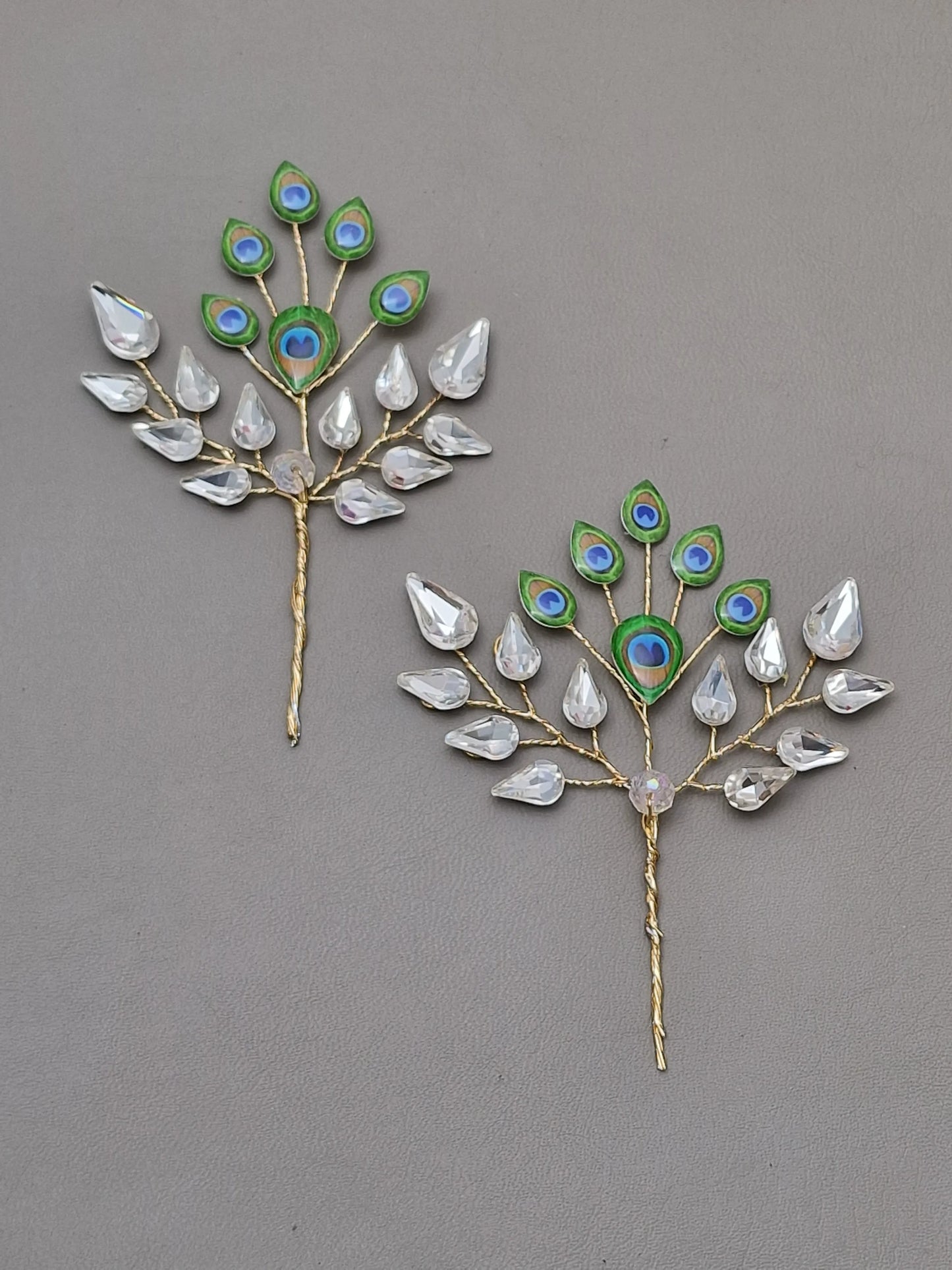 Inspired by the majestic charm of peacock feathers, this handcrafted hair pin. ideal for brides, bridesmaids, or festive Indian hairstyles needing a regal pop of color and sparkle.