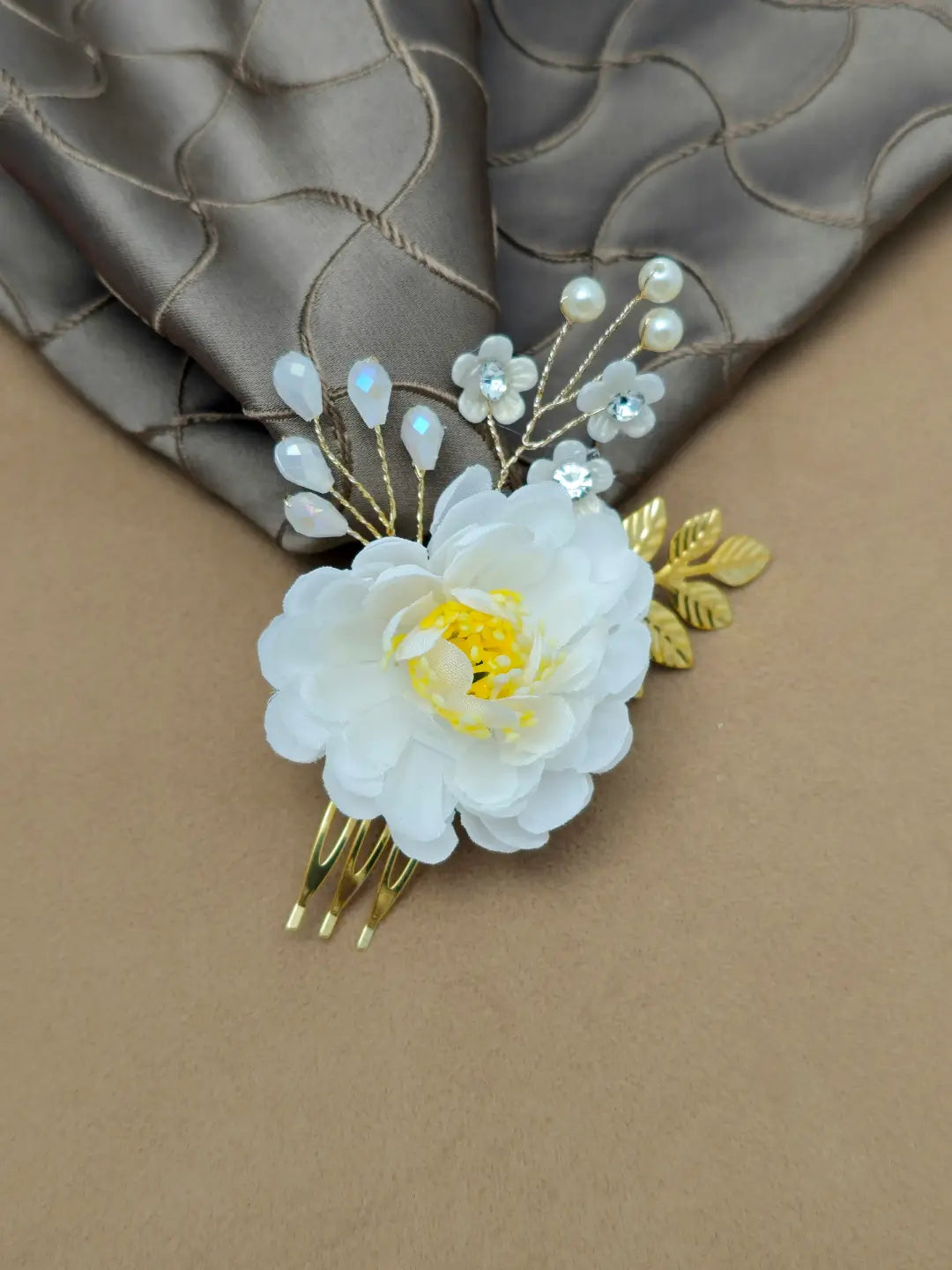 A soft, for bridal and festive hairstyles, this hair comb features a delicate white fabric flower adorned with pearl drops, crystal stones, and golden leaves.